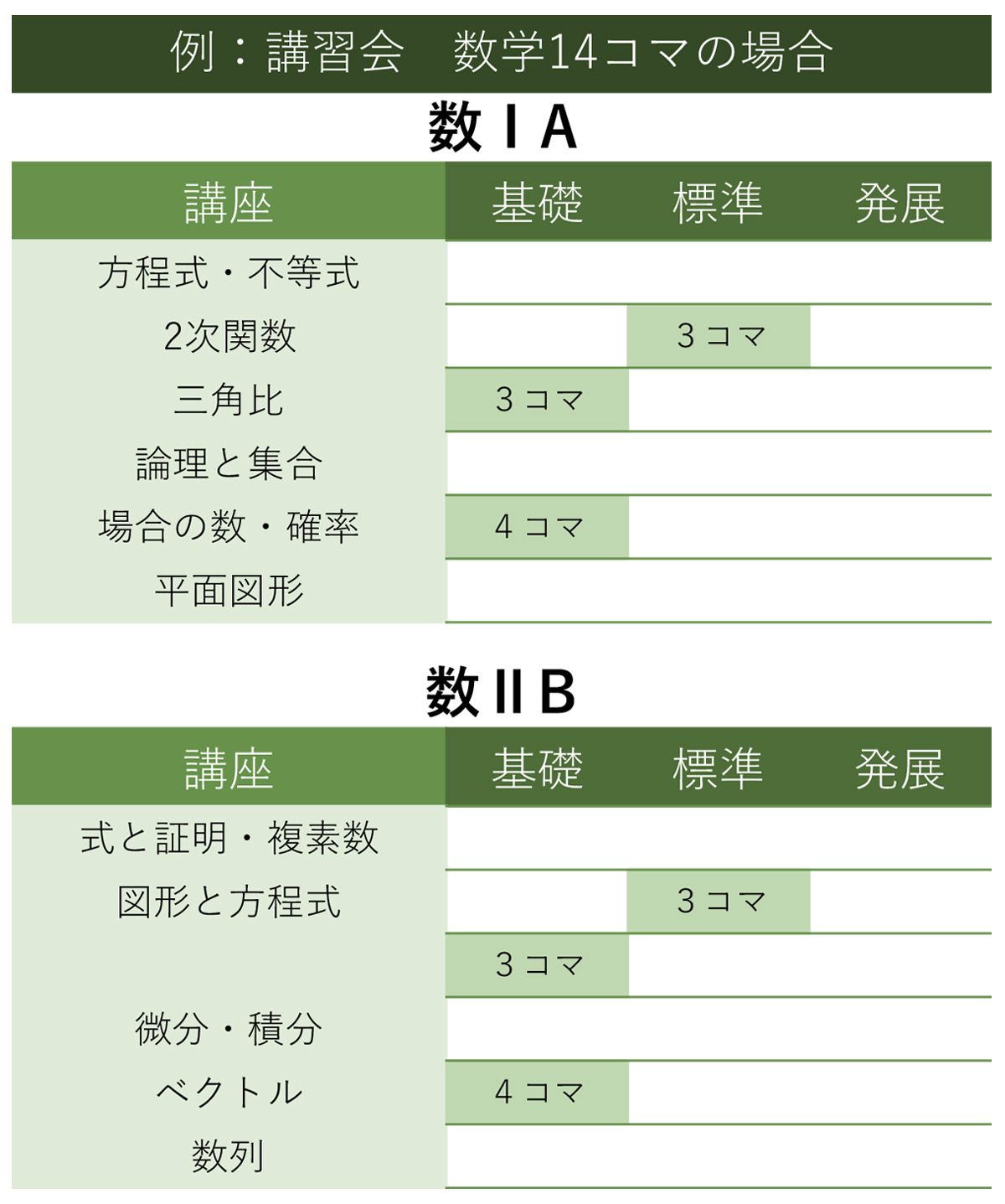 基本的な知識があり入試に向けてレベルアップしたい人、学校で演習量不足を感じている人向けのコースです。科目・単元に進度・テスト範囲に応じて柔軟に変更可能です。